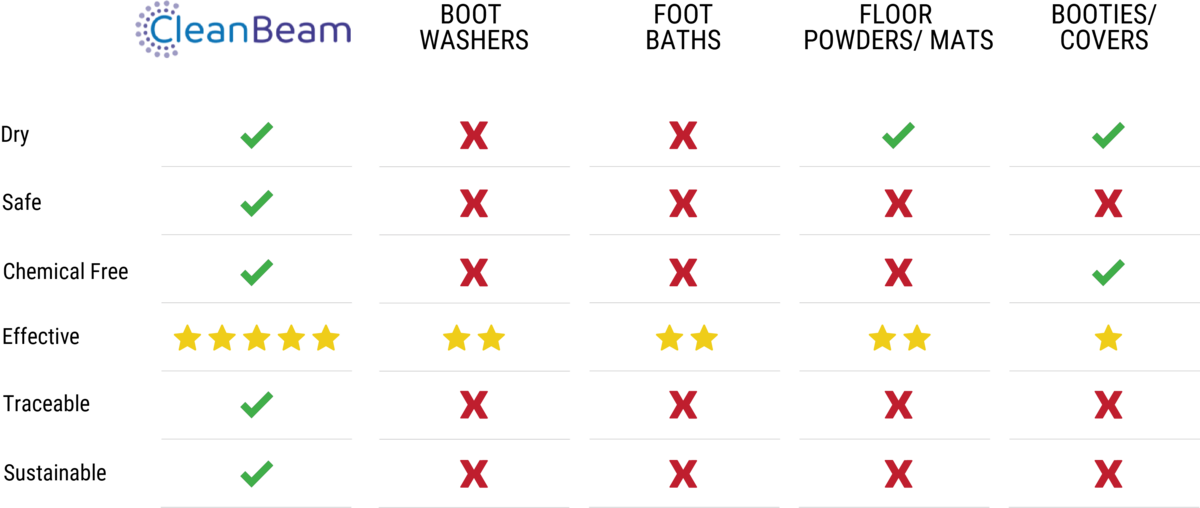 Our solutions are dry, safe and chemical free. Proven more effective in both lab and field studies, Clean Beam simplifies footwear and facility sanitation so food stays safe and people stay healthy.